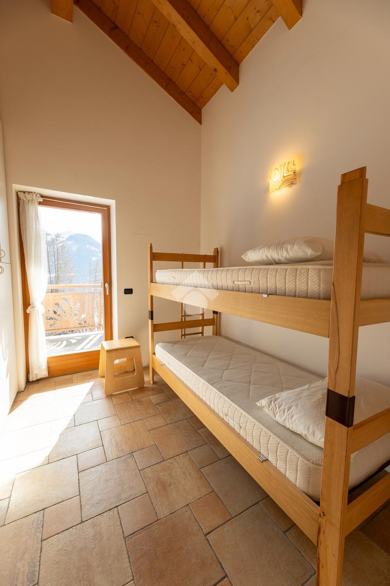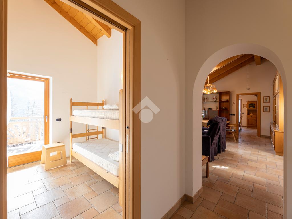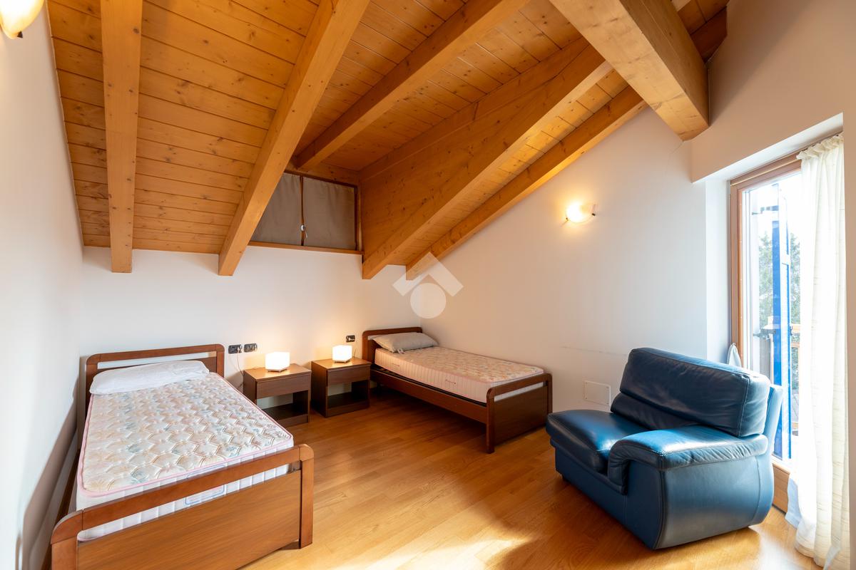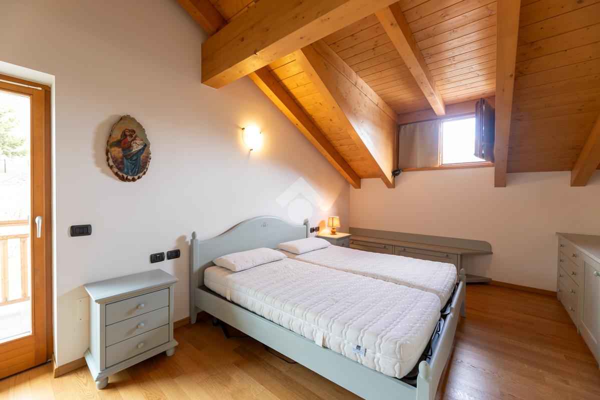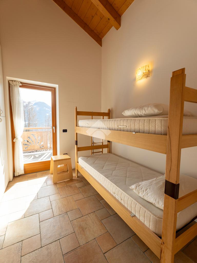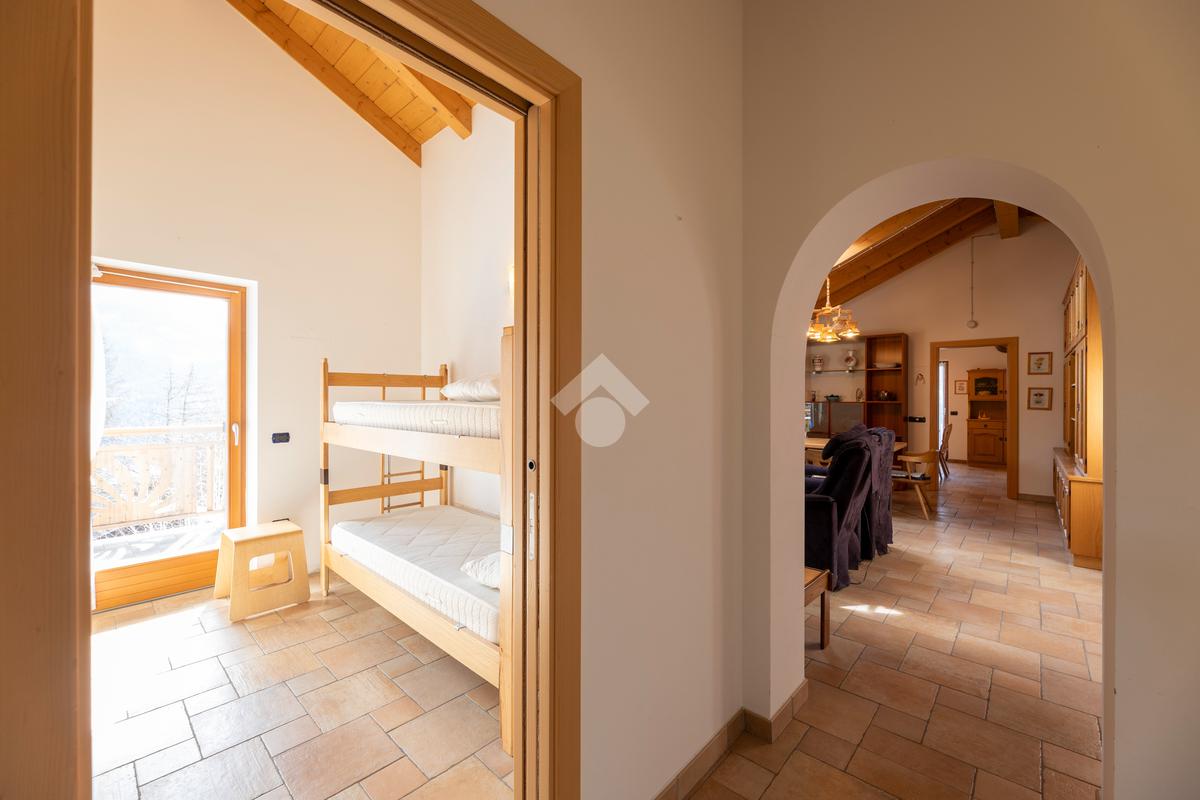 Il secondo appartamento è collocato al piano secondo e presenta una distribuzione funzionale e luminosa. La zona giorno comprende un soggiorno e una cucina abitabile separata con dispensa, affiancata da uno studio utilizzabile anche come ulteriore camera. La zona notte ospita due camere matrimoniali e due bagni. Sia la zona giorno che la zona notte sono servite da comodi balconi, con affacci aperti sul paesaggio montano.