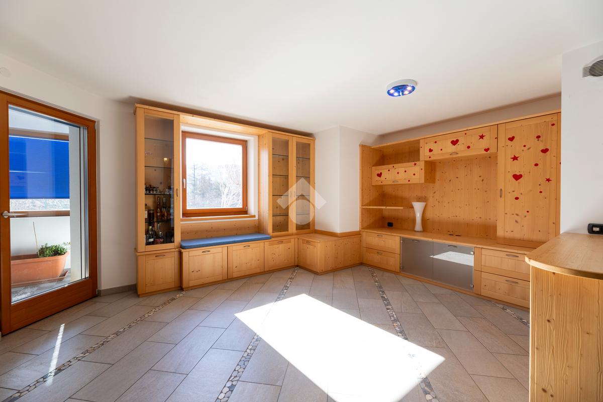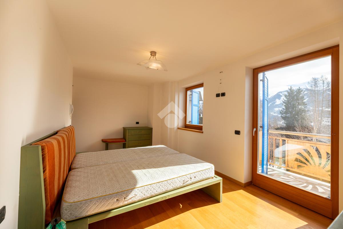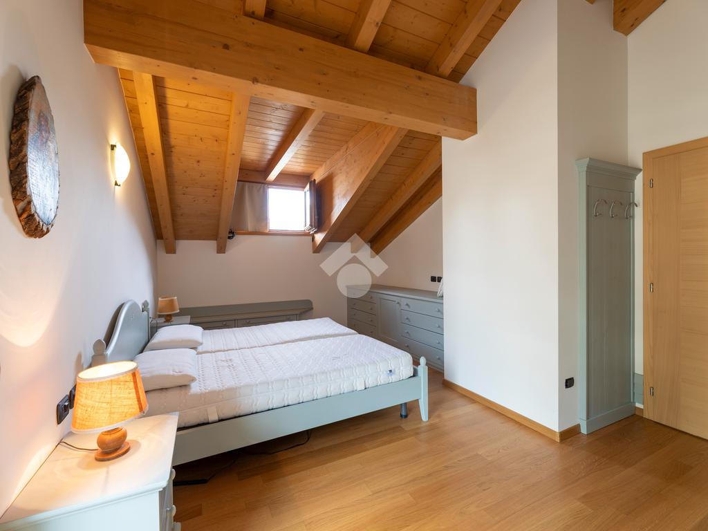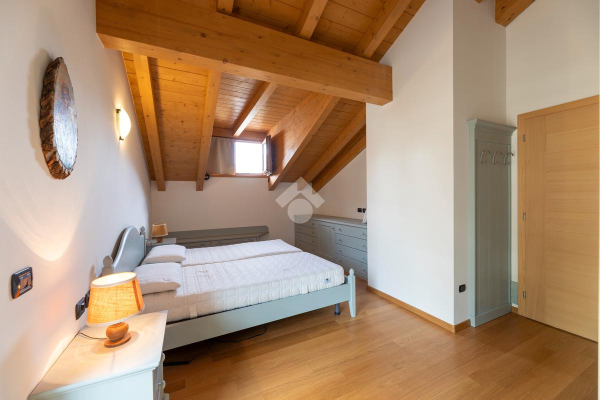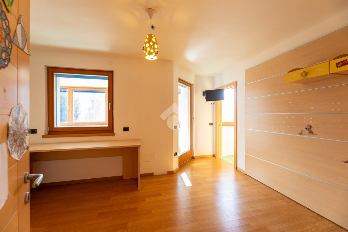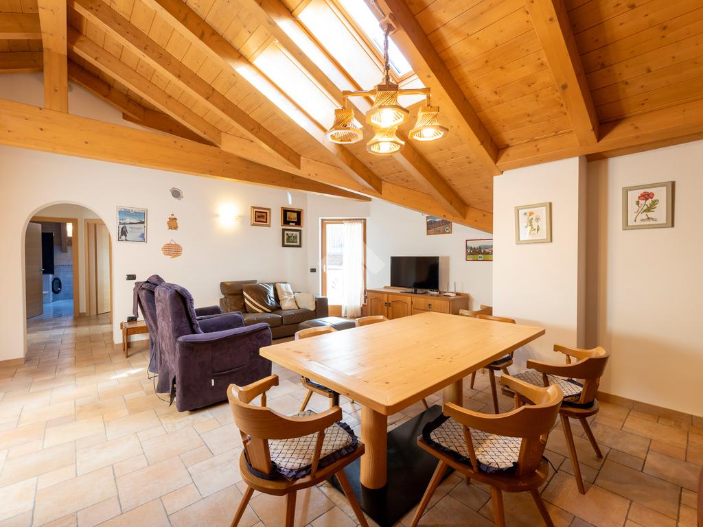 Il secondo appartamento è collocato al piano secondo e presenta una distribuzione funzionale e luminosa. La zona giorno comprende un soggiorno e una cucina abitabile separata con dispensa, affiancata da uno studio utilizzabile anche come ulteriore camera. La zona notte ospita due camere matrimoniali e due bagni. Sia la zona giorno che la zona notte sono servite da comodi balconi, con affacci aperti sul paesaggio montano.