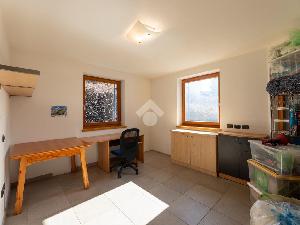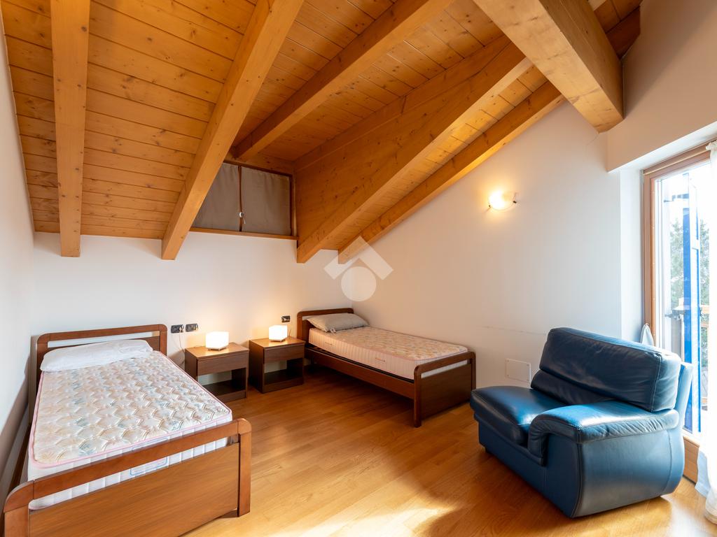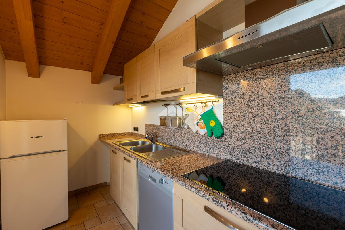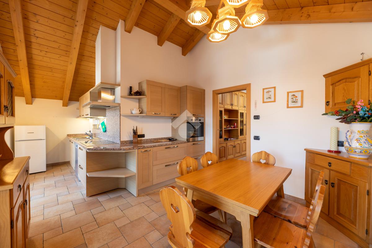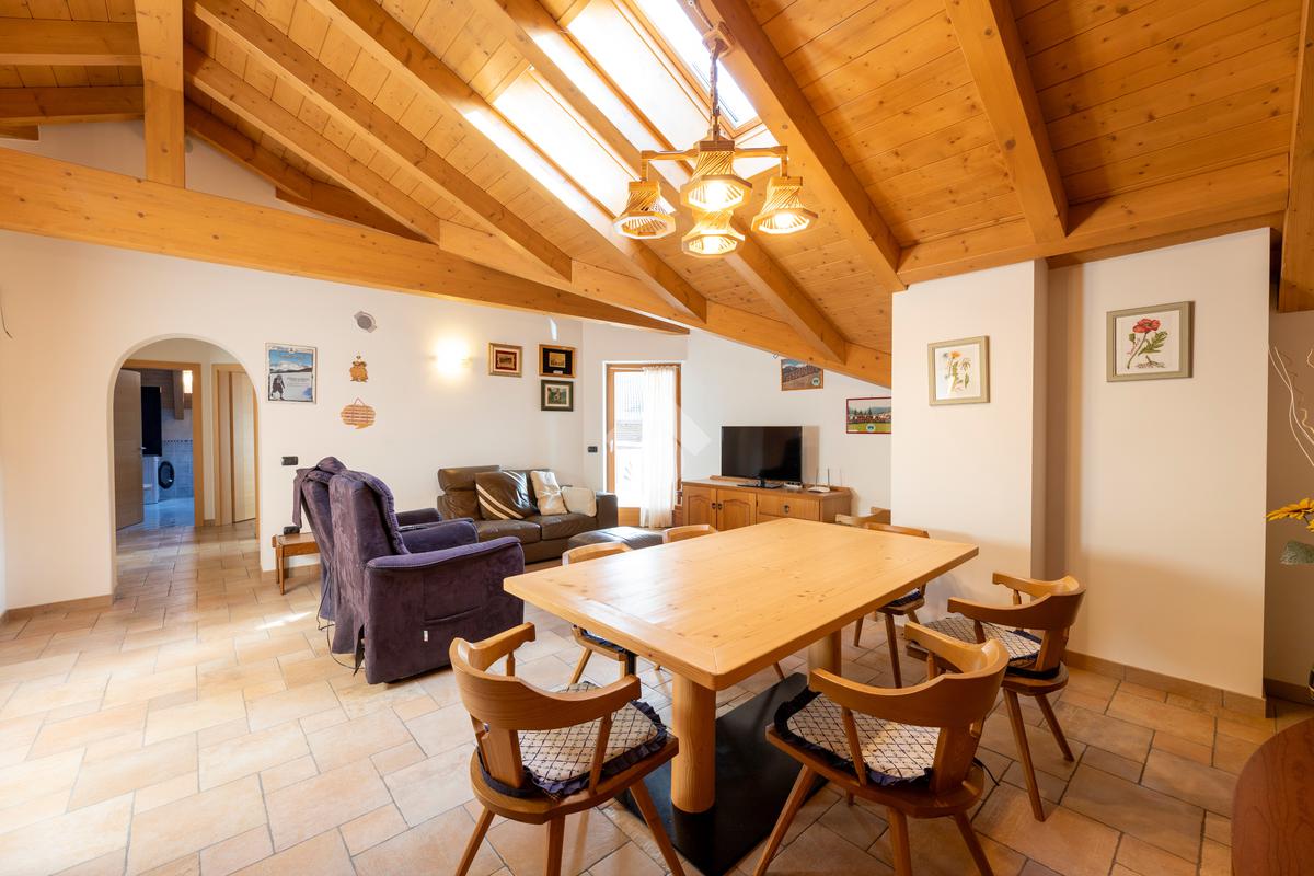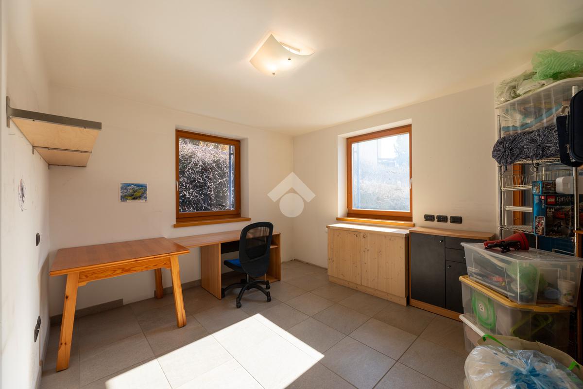 Il secondo appartamento è collocato al piano secondo e presenta una distribuzione funzionale e luminosa. La zona giorno comprende un soggiorno e una cucina abitabile separata con dispensa, affiancata da uno studio utilizzabile anche come ulteriore camera. La zona notte ospita due camere matrimoniali e due bagni. Sia la zona giorno che la zona notte sono servite da comodi balconi, con affacci aperti sul paesaggio montano.