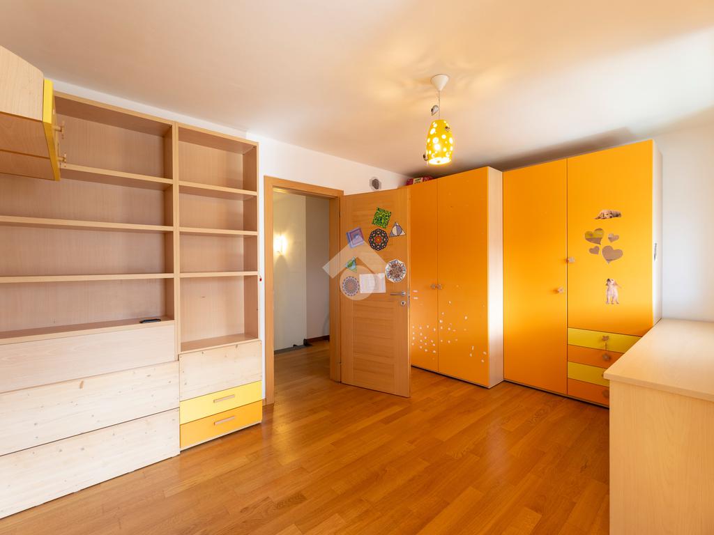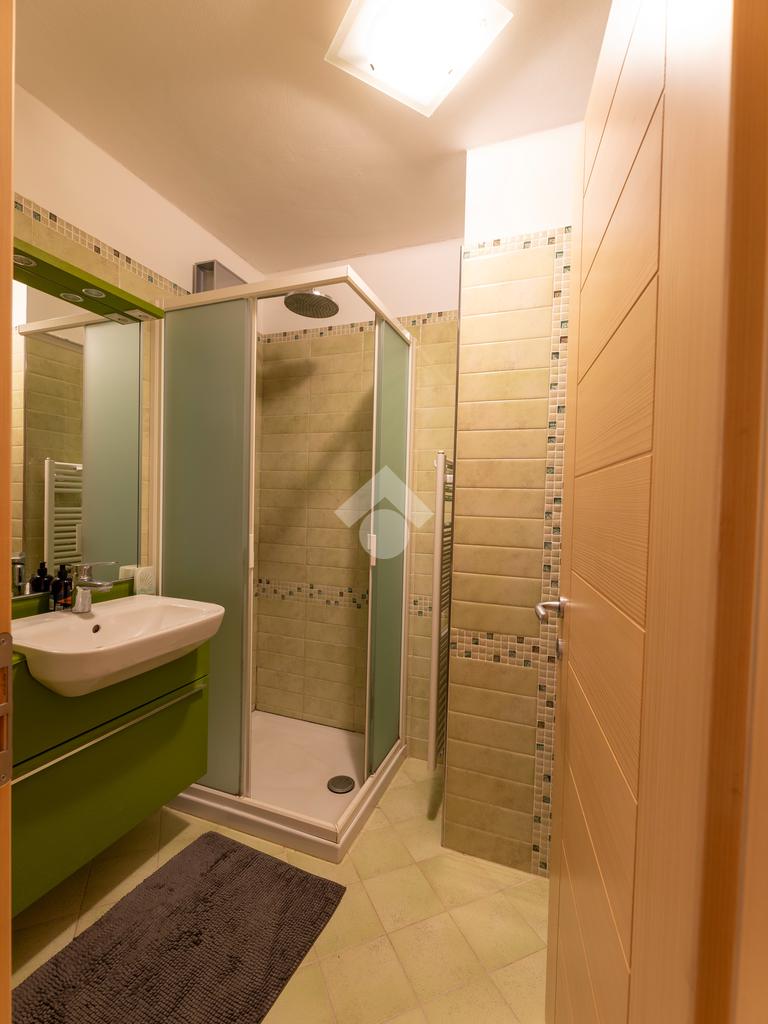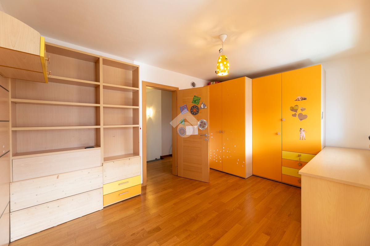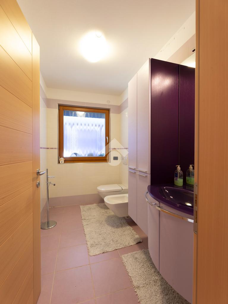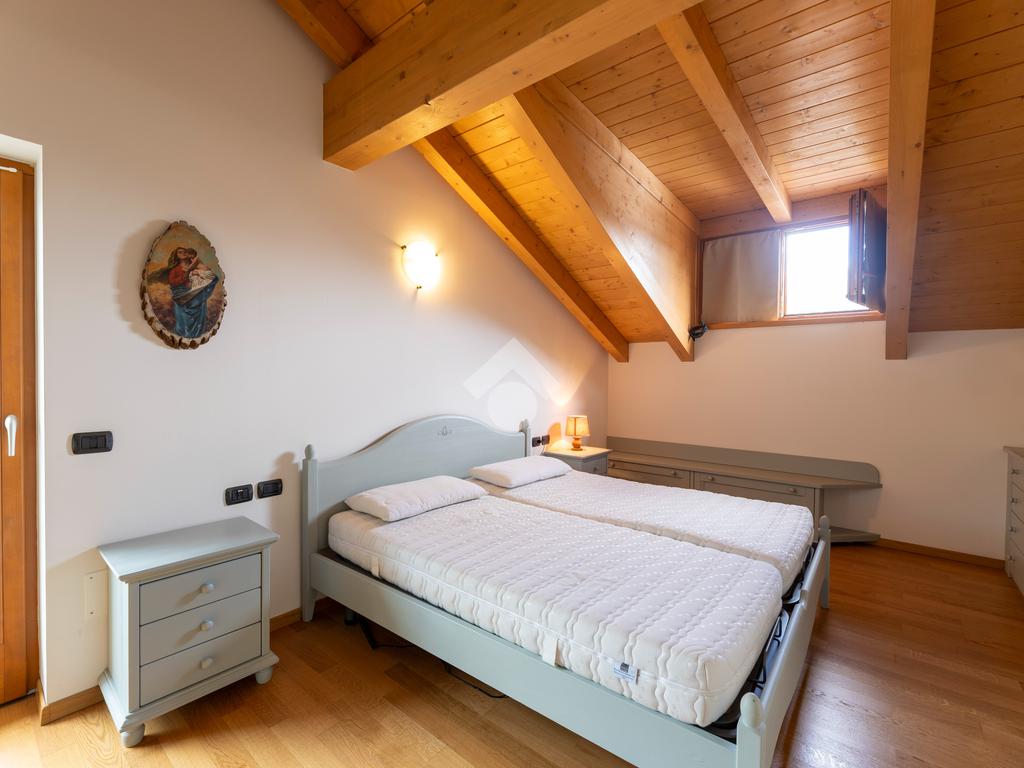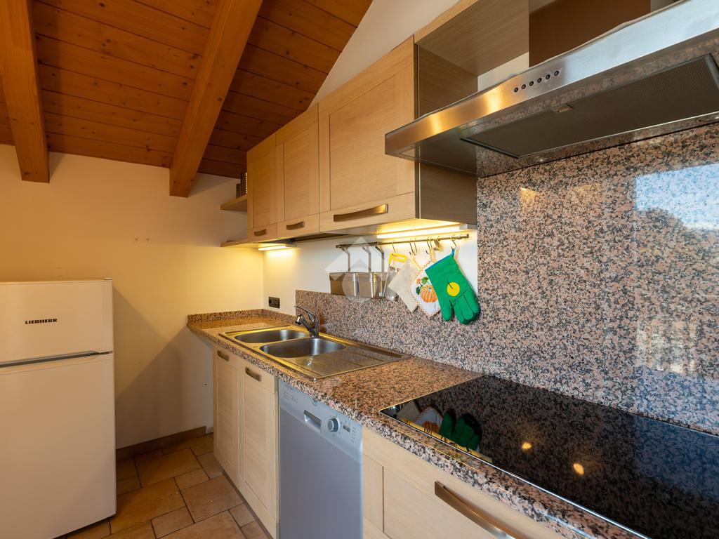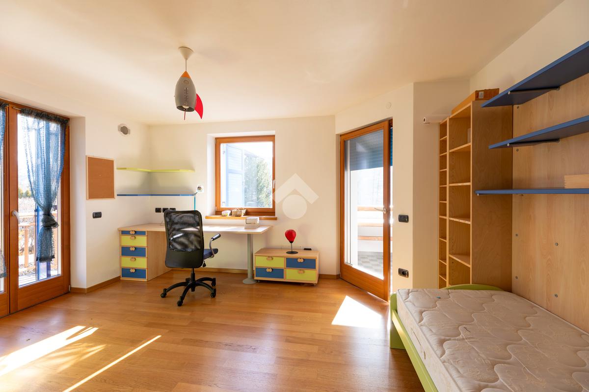 Il secondo appartamento è collocato al piano secondo e presenta una distribuzione funzionale e luminosa. La zona giorno comprende un soggiorno e una cucina abitabile separata con dispensa, affiancata da uno studio utilizzabile anche come ulteriore camera. La zona notte ospita due camere matrimoniali e due bagni. Sia la zona giorno che la zona notte sono servite da comodi balconi, con affacci aperti sul paesaggio montano.