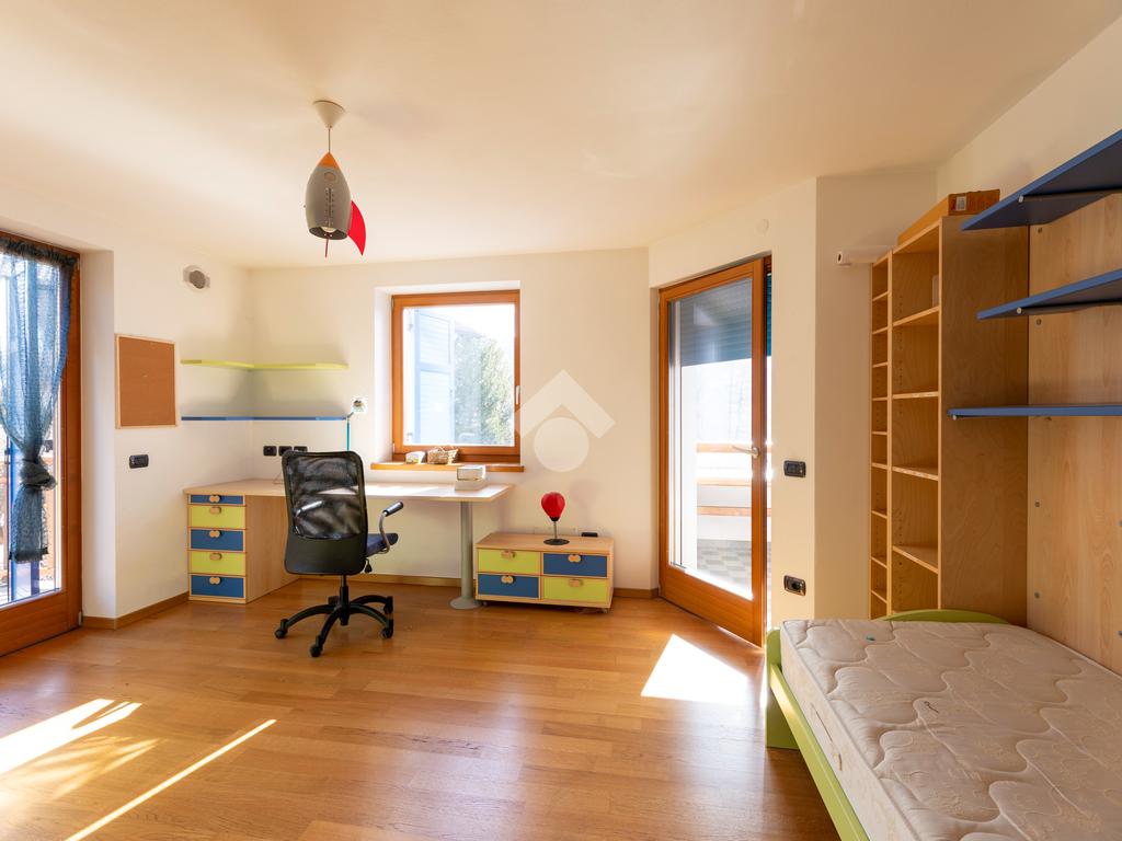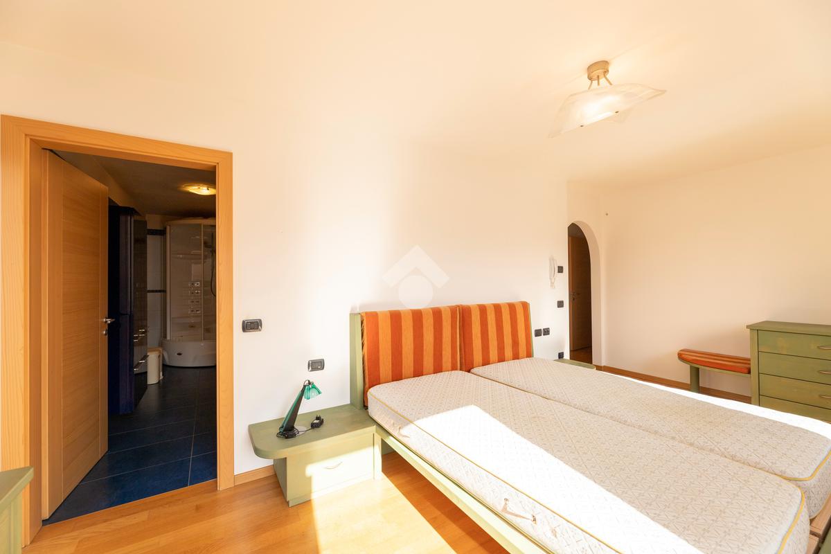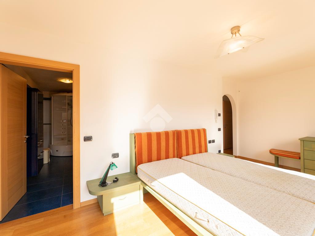 Il primo appartamento si sviluppa tra piano terra e primo piano. Al livello d’ingresso trova spazio una zona giorno ampia e ben articolata, composta da cucina abitabile separata con dispensa, soggiorno, studio, bagno finestrato e lavanderia. Gli ambienti si aprono direttamente sul portico e sul giardino, creando una continuità naturale con l’esterno. La scala interna conduce al piano superiore, dove si sviluppa la zona notte con quattro camere, di cui tre matrimoniali, quattro bagni e una cabina armadi di generose dimensioni.