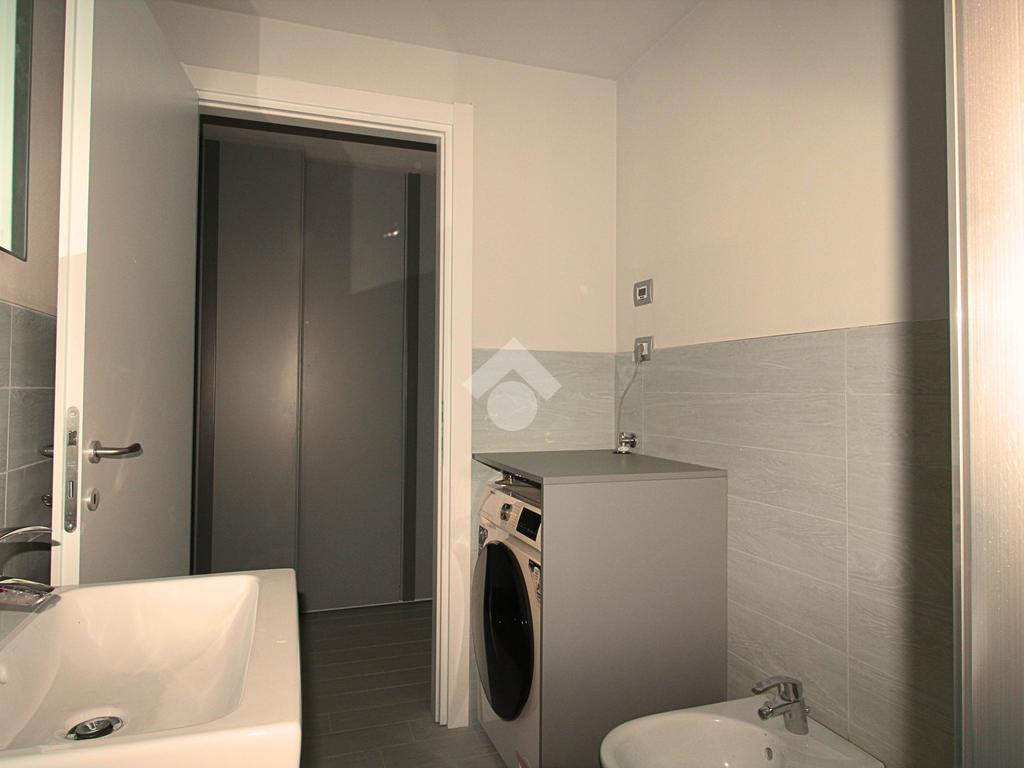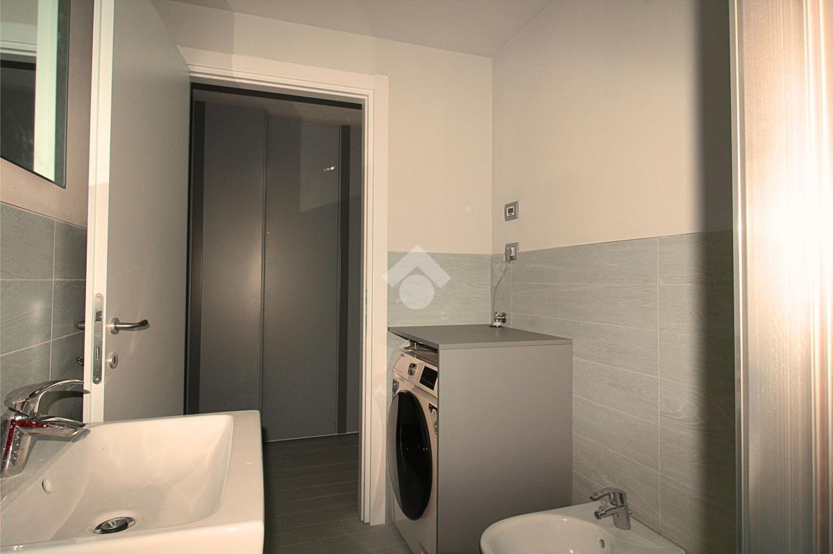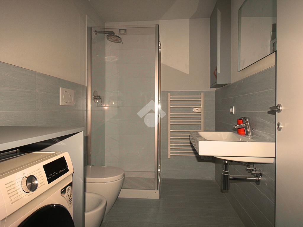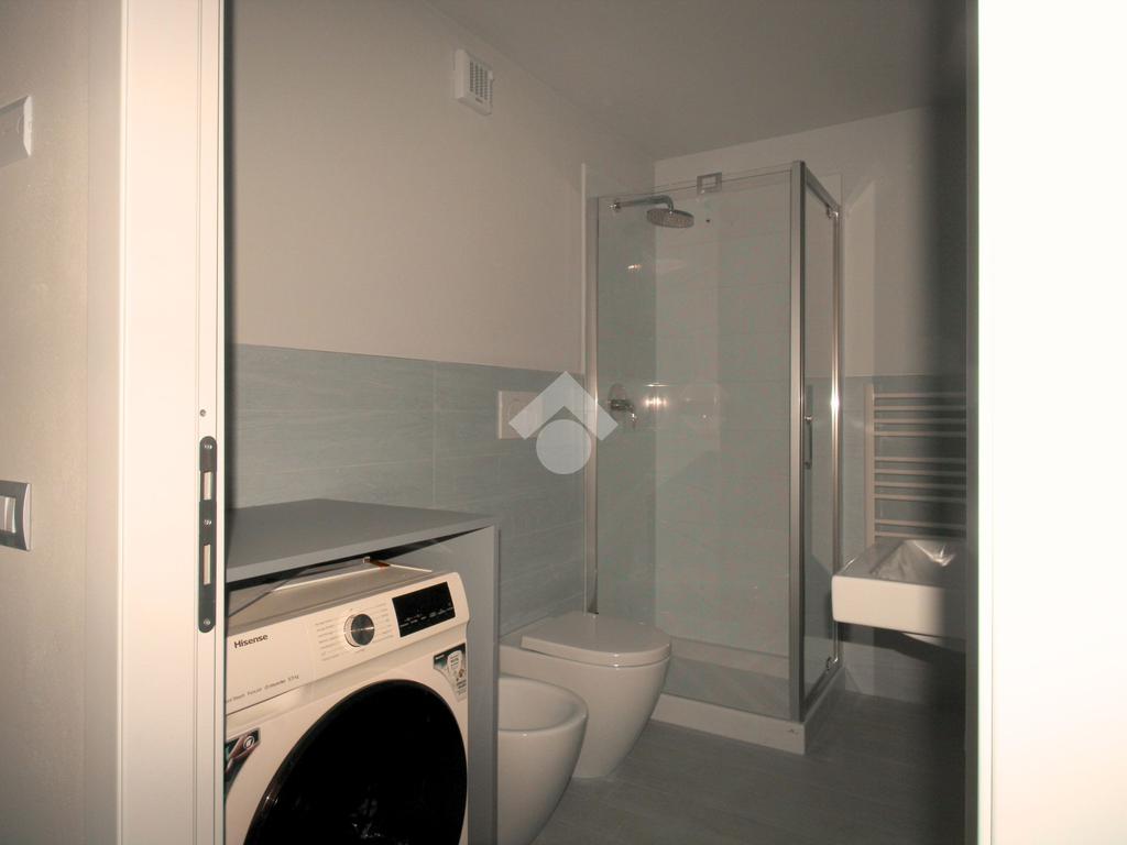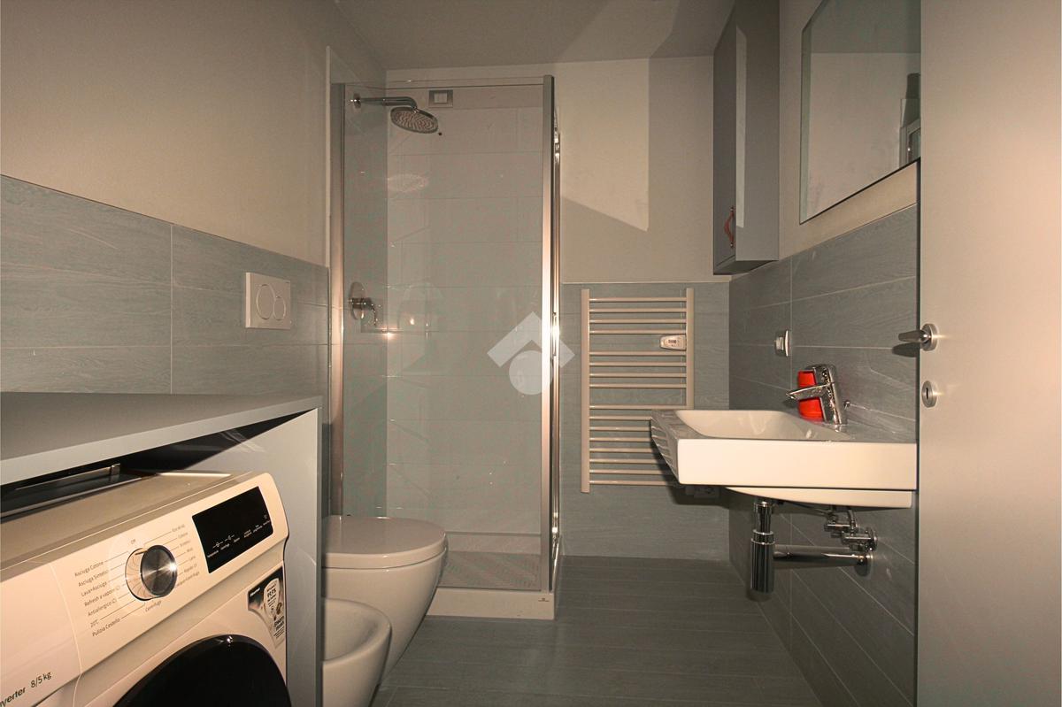 Il bagno, moderno e ben rifinito, dispone di box doccia e lavasciuga.