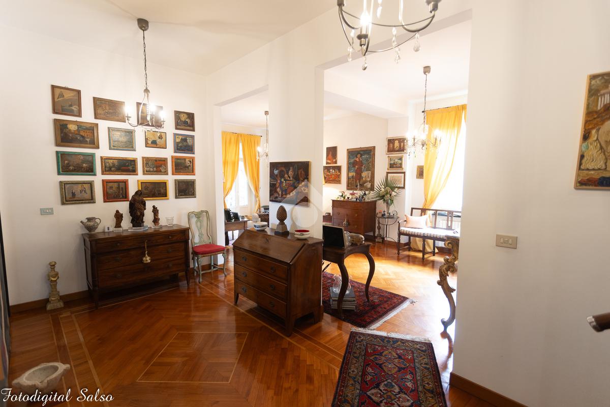 Davanti all'ingresso si apre una grande sala luminosa di 60 mq con diversi spazi da dedicare alla lettura o al relax, un balcone in pieno stile Liberty si affaccia sul verde del giardino.