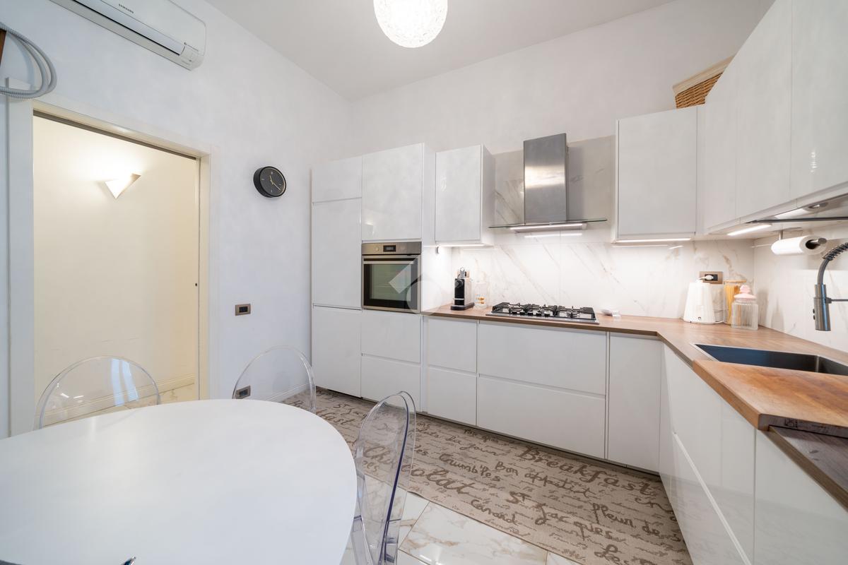 L’ingresso conduce a un soggiorno molto luminoso con balcone affacciato direttamente sul viale, un contesto elegante e alberato che rappresenta uno dei principali punti di forza dell’immobile. La cucina, separata e di generose dimensioni, è pienamente abitabile e completa la zona giorno.