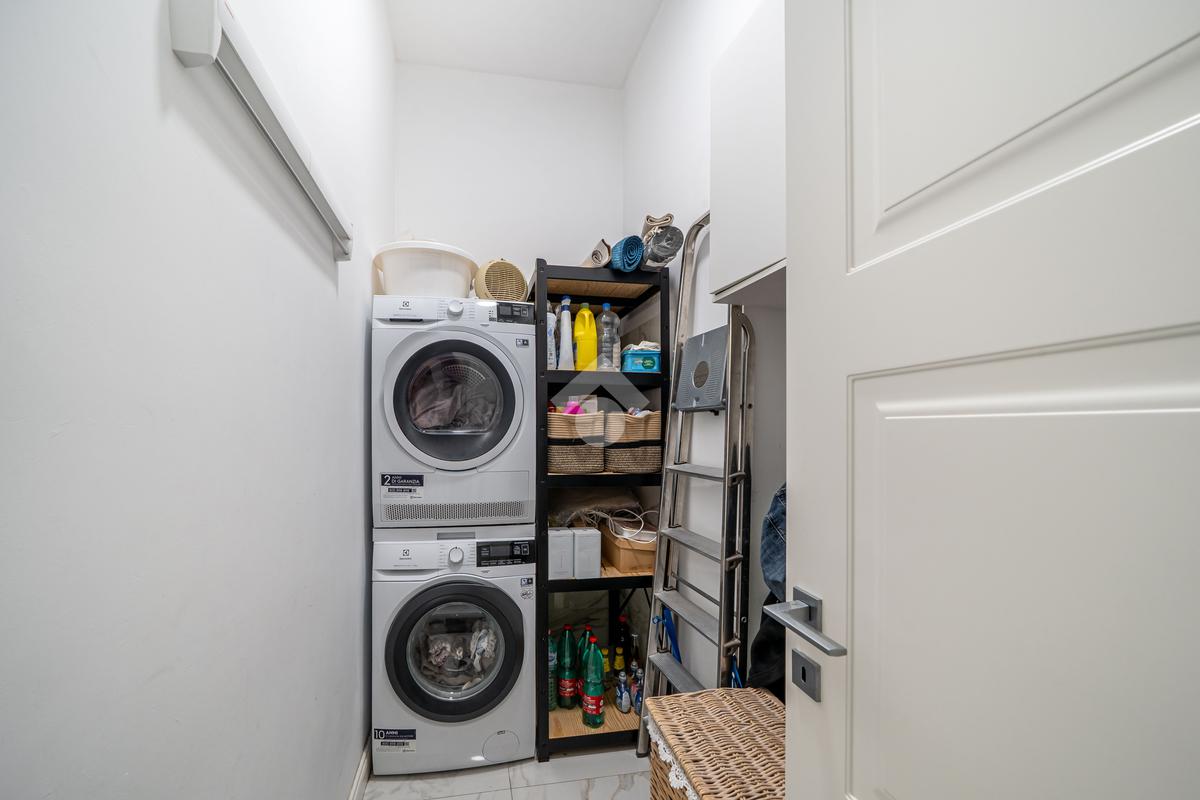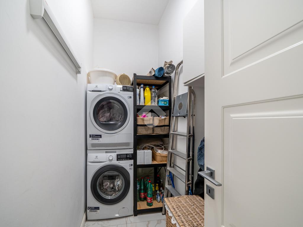 La zona notte è ben distribuita e comprende due camere matrimoniali, due bagni entrambi finestrati — uno dei quali con vasca idromassaggio — e una comoda lavanderia. L’appartamento è dotato di riscaldamento termoautonomo e aria condizionata, con spese condominiali particolarmente contenute, circa 20 euro mensili.